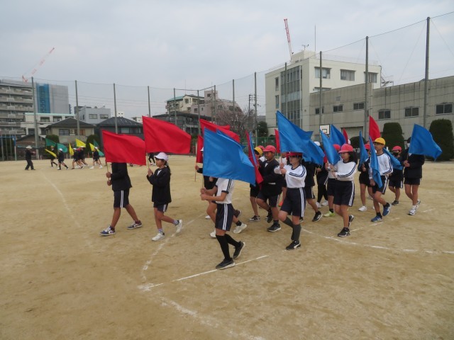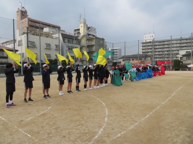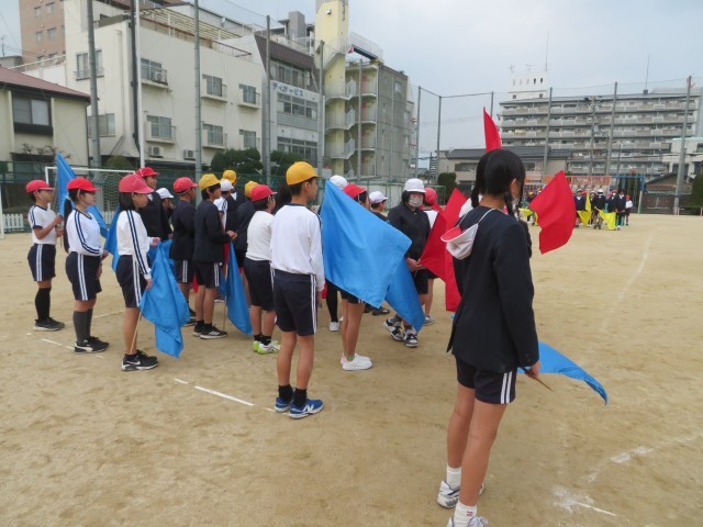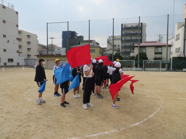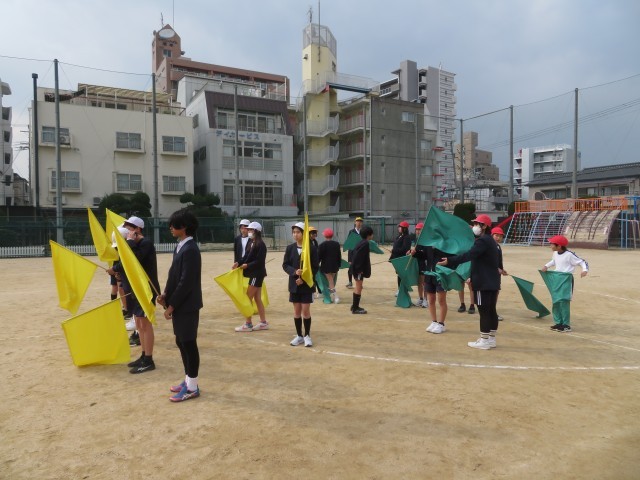 学修参観に向けて運動場でフラッグの動き、立ち位置、隊形移動について練習しています。全員の真剣な姿が見られるよう全力で頑張ります。