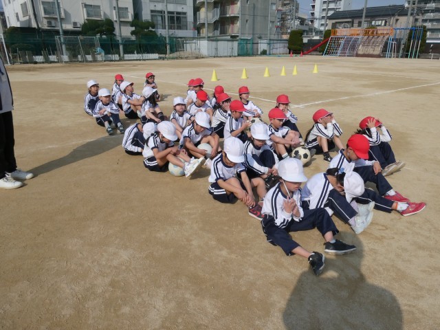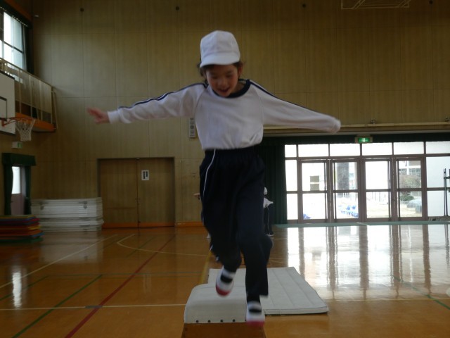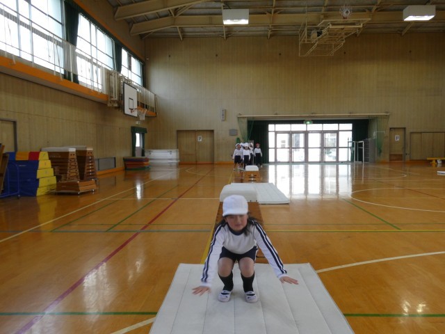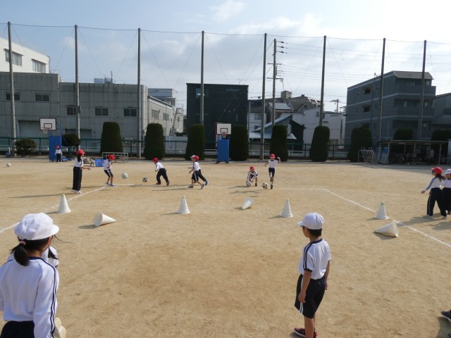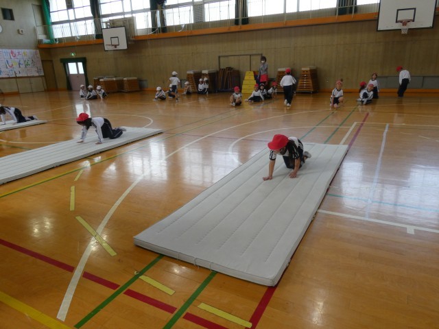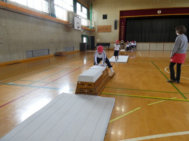 2組はマット運動やとびばこ運動で体力を高めています。1組は汗ばむ陽気の下、運動場でボール運動をしています。