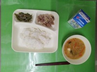 今日の献立は、レーズンパン、牛乳、豚肉のカレー風味焼き、コーンスープ、カリフラワーのピクルスです。
