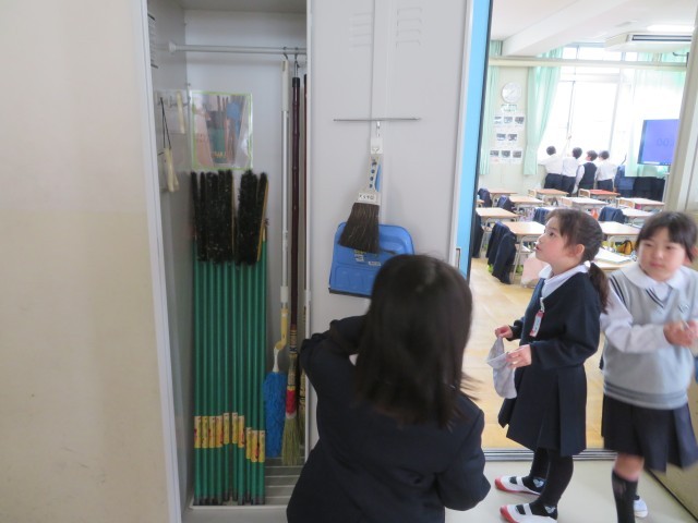 掃除の時間が終わりました。いつも掃除ロッカーの中のほうきはきれいに整えられています。次に使うときのことを考えて片づけられています。