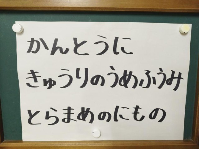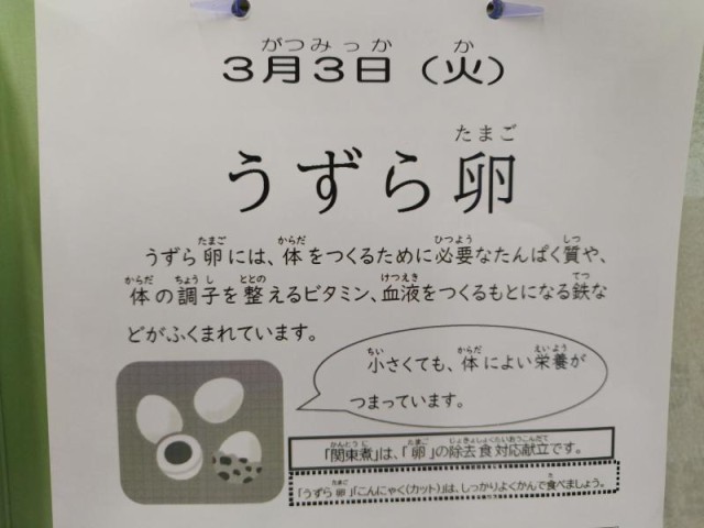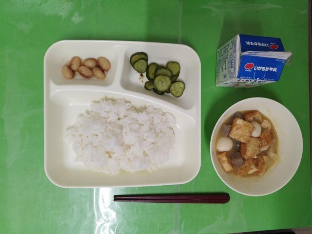 今日の献立は、ごはん、牛乳、関東煮、きゅうりの梅風味、とら豆の煮ものです。