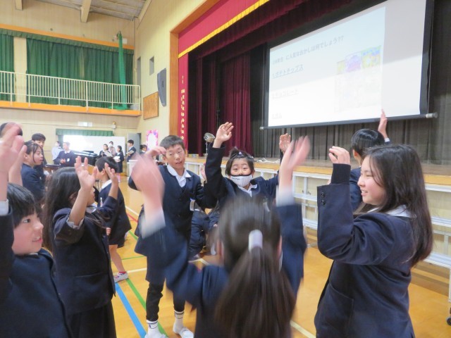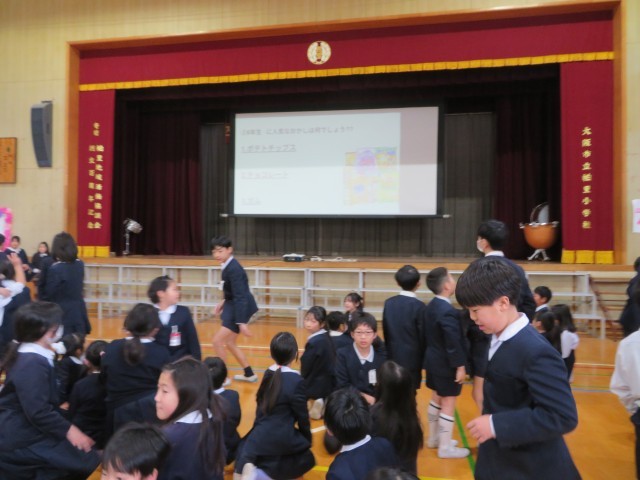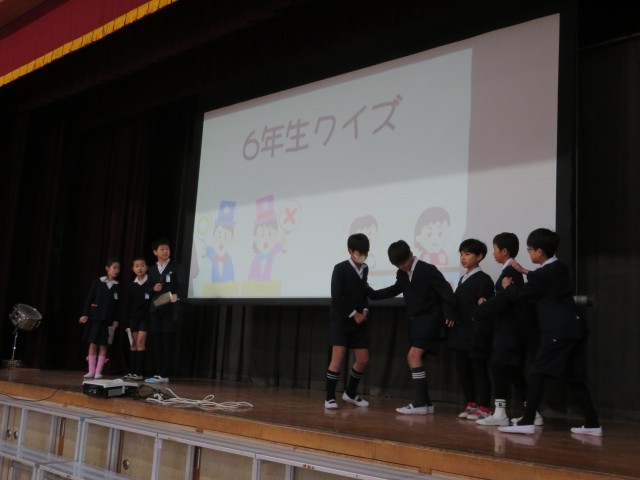 みんなでゲームその2は「6年生クイズ」です。班対抗の6年生に関係する3択クイズです。さあみんなで協力して全問正解をめざします。