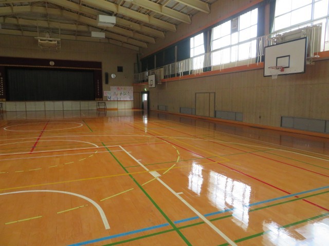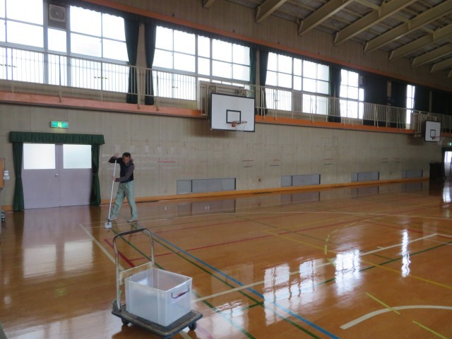 講堂のフロア全面にワックスをかけています。管理作業員の長年の経験と知識でピカピカに磨きあげられます。きれいになった講堂で、卒業式を迎えられそうです。