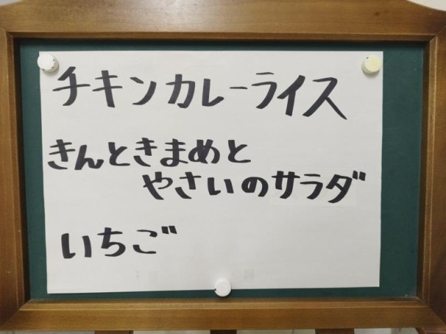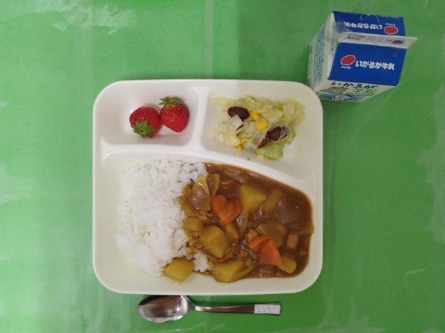 今日の献立は、チキンカレーライス、金時豆と野菜のサラダ、いちご、牛乳です。