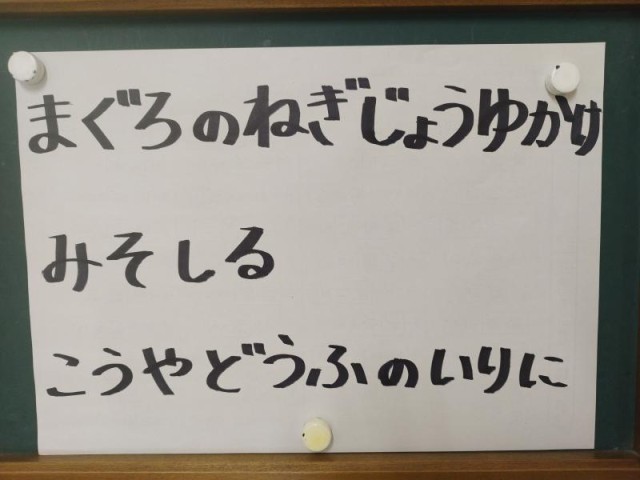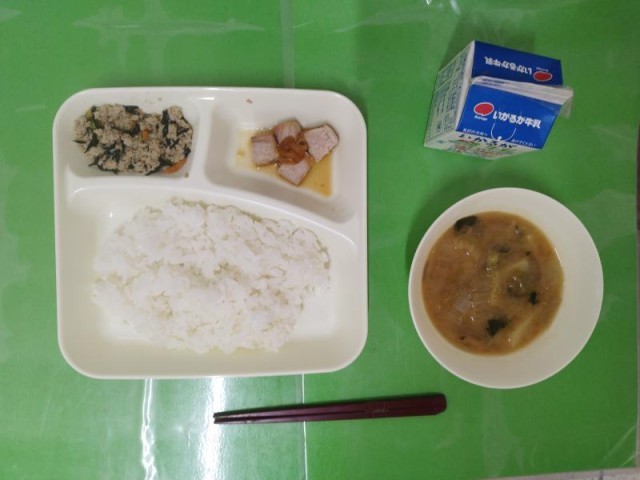 今日の献立は、ごはん、牛乳、まぐろのねぎじょうゆかけ、みそ汁、高野豆腐のいり煮です。