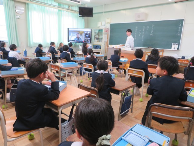 2年生、モニターに体を向けて話を聞いています。残り少ない時間ですが、お世話になった教室を美しくしようと看護当番の先生から話がありました。ピカピカにして次の学年に渡しましょう。