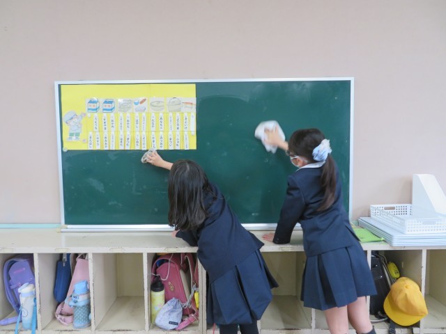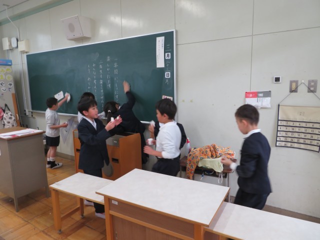 お世話になった、靴箱、ロッカー、黒板、配膳台、その他いろいろなところをきれいに清掃しています。ピカピカにするぞー!雑巾をしっかりこすって汚れを落としました。次の学年の人が気持ちよくスタートできるようにしっかり掃除します。