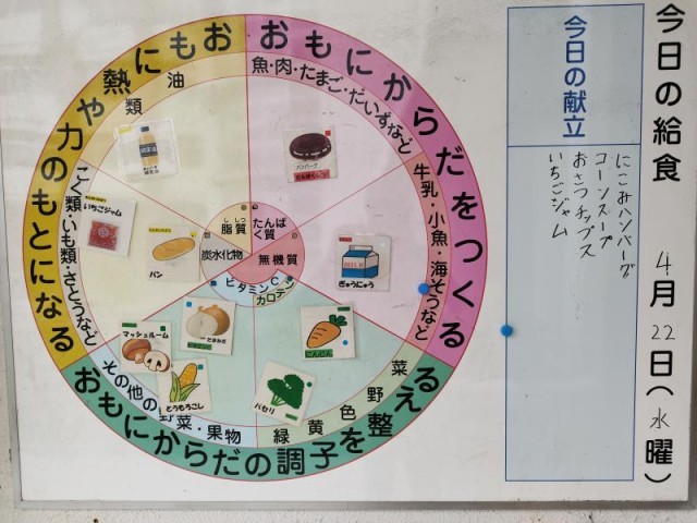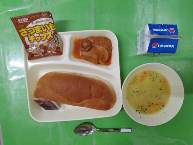 今日の献立は、コッペパン、牛乳、煮込みハンバーグ、コーンスープ、おさつチップス、いちごジャムです。