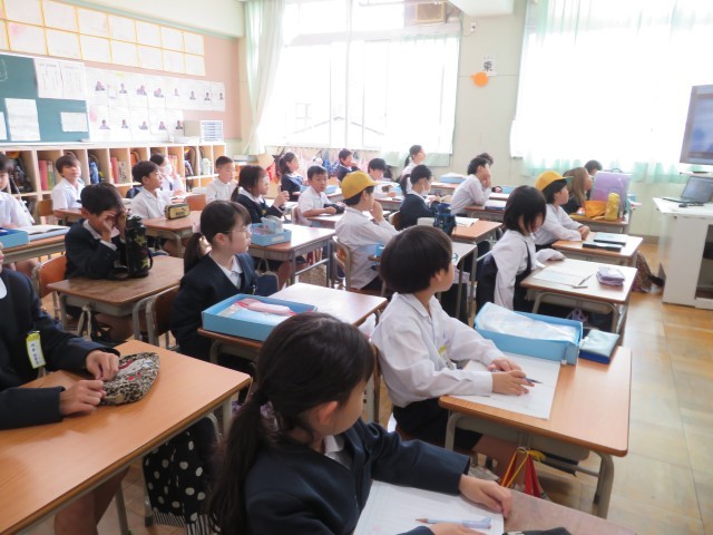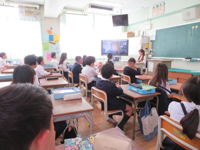 姿勢よく聞きます。担任の先生がモニター越しに写って3年2組はドキドキわくわくしています。