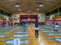 新2年生の歓迎の演技を新6年生が聞いています。新6年生が前日準備として入学式の会...