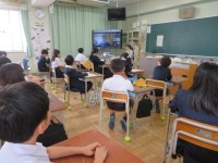 5年生も真剣に校長先生の話をきいています。5-2教室と、校長先生で、リモートでの...