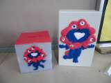 創造性豊かな貯金箱が集まっています。今年は万博のミャクミャクが描かれた作品も多か...