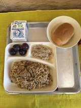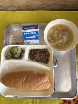 【今日の献立】 ・牛肉のソース煮 ・スープ ・きゅうりのピクルス ・コッペパン、...