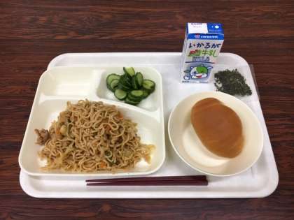 焼きそば(のり) きゅうりのしょうがづけ パン 牛乳