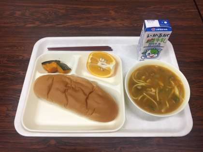カレースープスパゲッティ 焼きかぼちゃ あまなつかん パン 牛乳