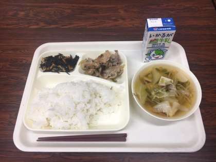 豚肉のごまだれ焼き 五目汁 ひじきのいため煮 ごはん 牛乳