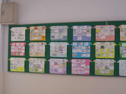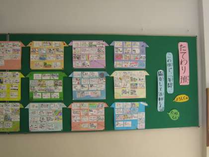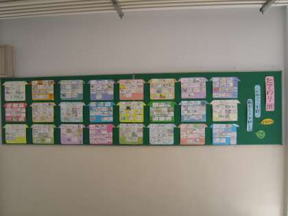 先日、行われたたてわり班編成の際に製作した各班の自己紹介カードが完成して、玄関近くの掲示板に掲示しています。台紙の形にお気づきでしょうか。各班が一つの家族のように絆を深めていくという願いを込めて「家の形」にしています。ご来校の際は、ぜひ一度、ご覧いただけたらと思います。