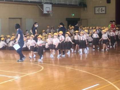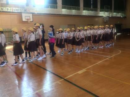 津波警報発令の放送により、講堂校舎4階のプールに避難開始です。