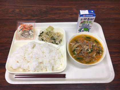 マーボーはるさめ チンゲンサイともやしの甘酢あえ アーモンドフィッシュ ごはん 牛乳