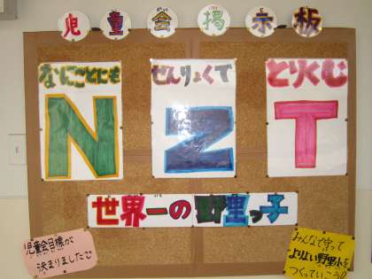 また、玄関付近に設置している児童会の掲示板には、6月の学校だよりの中でもお知らせしました今年度の児童会目標「N(なにごとにも)Z(ぜんりょくで)T(とりくむ)世界一の野里っ子」が掲げられました。今日の活動も、この目標通り誰もが全力で取り組んでいました。