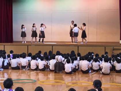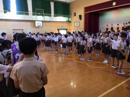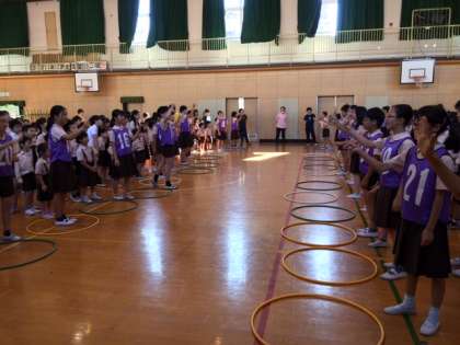 縦割りの奇数班と偶数班で一人ずつ順番にじゃんけんをしあい、負けたら輪の中に入るという「じゃんけんゲーム」を行いました。とても楽しそうに遊んでいました。