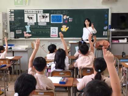 「牛乳の中にカルシウムがどれくらい入っているか?」「カルシウムをとるのに牛乳を一日に何本飲んだらよいか?」「カルシウムが多く入っている食材は?」等いろいろなお話を伺うことができました。