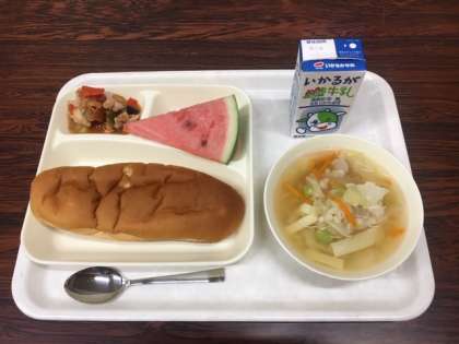 鶏肉と夏野菜のソテー 押麦のスープ すいか パン 牛乳