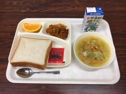 かぼちゃのミートグラタン スープ オレンジ いちごジャム パン 牛乳