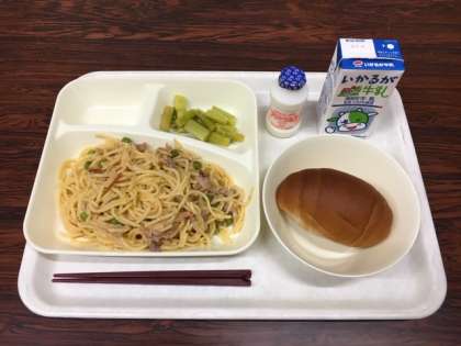 ポークトマトスパゲッティ グリーンアスパラガス 発酵乳 パン 牛乳