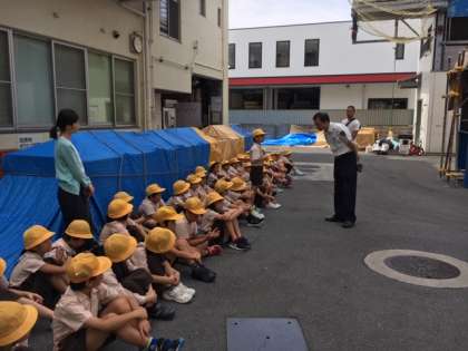 はしご車には、実際に担任2人が交替で、はしごの先端まで乗せてもらいました。