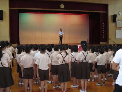 7月19日(金)、1学期の終業式を行いました。講堂に全校児童が集まり、大阪市歌を全員で歌った後、まず校長先生のお話を聞きました。