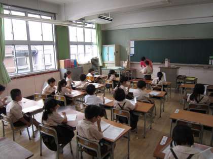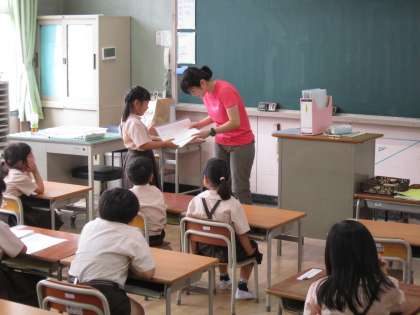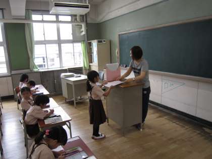 1年生が初めての通知表(あゆみ)を担任の先生から受け取っている様子です。