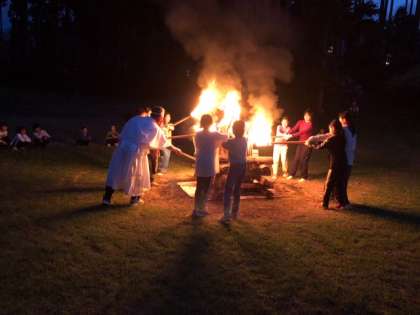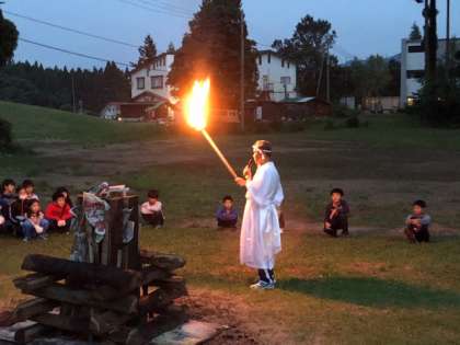 持っている火を子どもたちに分け与え、たき火に点火しました。