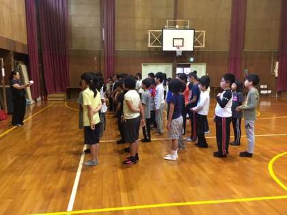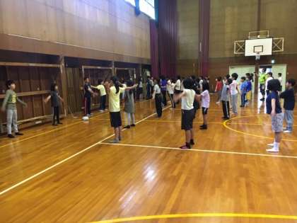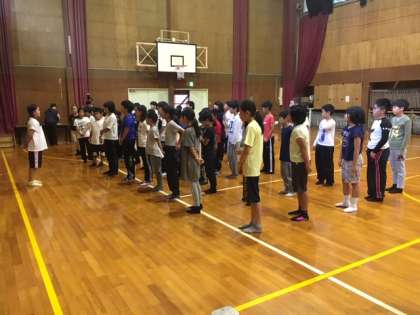 少し雨が降っているため、体育館で朝会・ラジオ体操・連絡をしました。