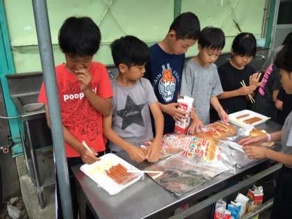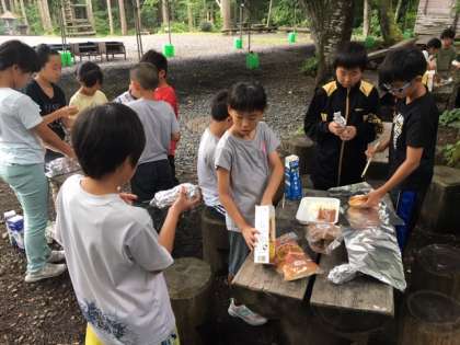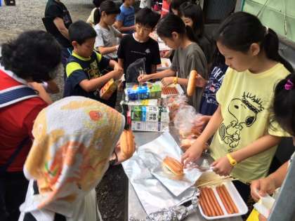 パンに野菜とウィンナーをはさみ、アルミホイルで包みます。