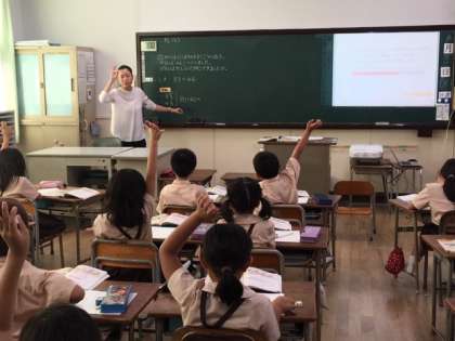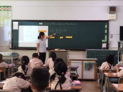 本日、大阪市教育委員会の指導主事の先生にお越しいただいて、1年2組と2年2組で算数の研究授業を行いました。