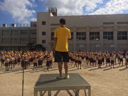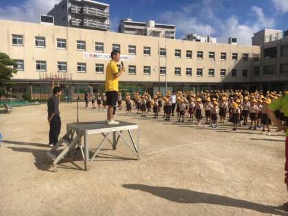 本日の児童朝会は、通常の朝会の後、運動会に向けて「ラジオ体操」とトラック周辺の石拾いをみんなで行いました。
