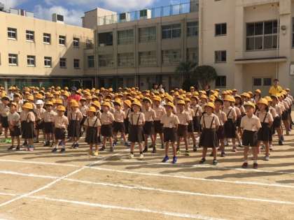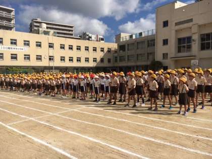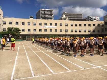 学校長の話の後、インターンシップの大学生2名の紹介、6年生児童2名による修学旅行の報告、最後に、「運動会の歌」の練習がありました。