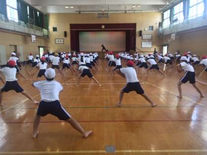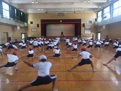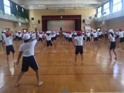 5・6年生が体育館で、運動会に向けて「ソーラン」の踊りの練習をしています。