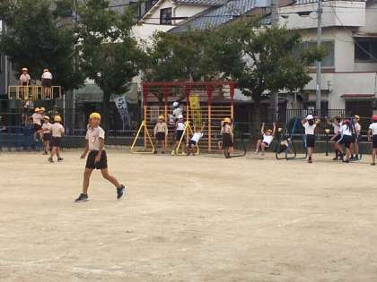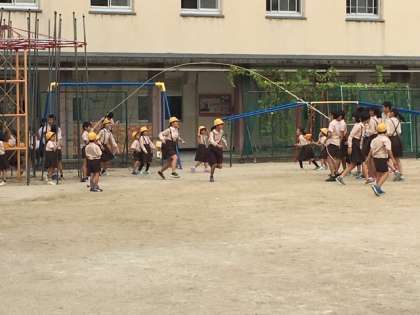 みんな思い思いに走りまわったりして遊んでいます。大なわとびで遊んでいる6年生もいます。