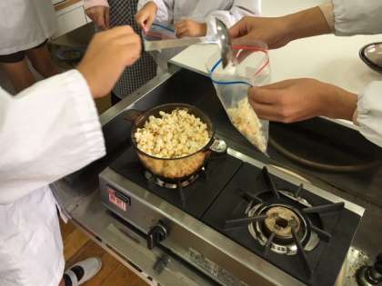 透明な容器を使ったので中の変化のようすがよく分かりました。ポップコーンがはじけてできあがっていくと、歓声が上がりました。