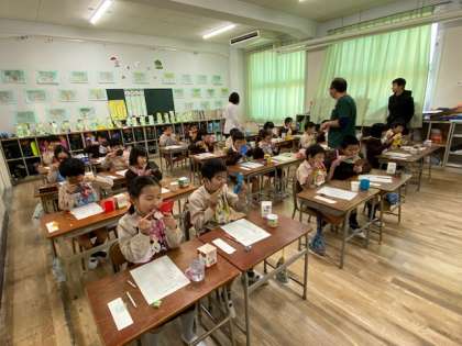 それぞれ上の前歯の一本を歯こう染色液で染めてもらうと、磨き残した歯こうの部分が赤くなりました。それを落とす磨き方を教わりました。みんな一生懸命磨いていました。