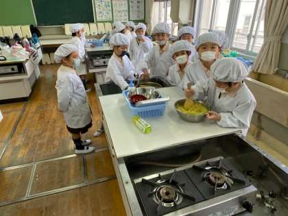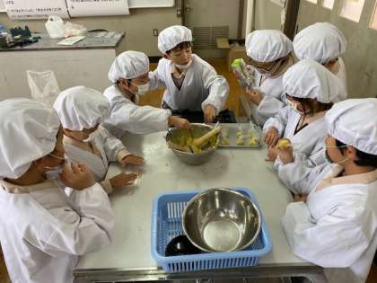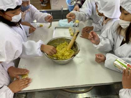 本日2年生は、収穫したさつまいもを使って、いもきんとんを作りました。