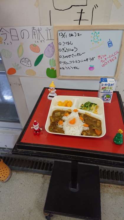 ※給食室の中学年用見本です。(調理員さんが、ご飯をツリー型に盛って、真ん中にサンタさんを飾ってくれました。)