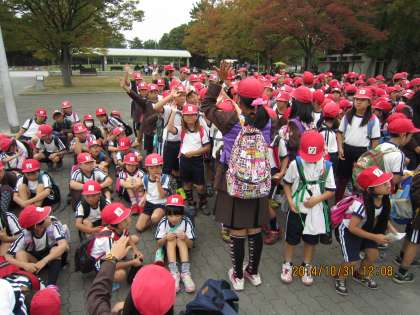今日は野里小学校の全児童で服部緑地公園に行きました。服部緑地公園では、1年生から6年生までの縦割り班に分かれて、各ポイントをめぐるオリエンテーリングを行いました。高学年は時間内にみんなが楽しく活動できるように頑張り、低学年は高学年をお手本に楽しく活動することができました。