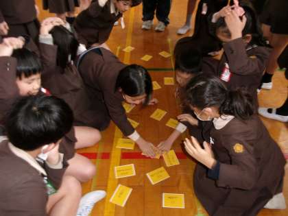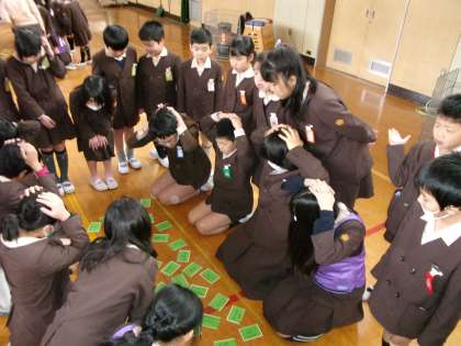 たてわり班対抗で行い、各班の低・中・高学年同士が対戦しました。カルタは、ことわざカルタを使用し、勝敗は、取ったカルタの枚数で決まります。冬休み中にしっかりとことわざを覚えてきた児童も多く、一枚を争う接戦のところがたくさんあって大変盛り上がった大会になりました。