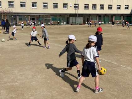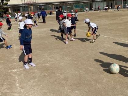1年生は、2クラス合同の体育の授業で、サッカーの前段階の「ボールけり」をしました。