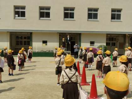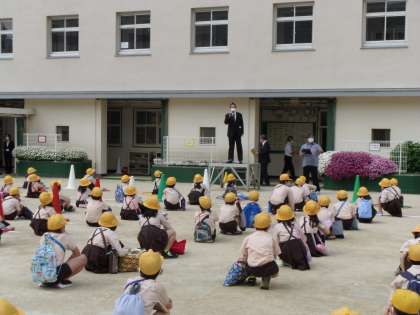 運動場に集合して新しく赴任された教職員の紹介や転入児童の紹介を行い、その後、校長先生の話や生活指導部長の話を聞きました。