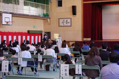 1年生の子どもたちにとっては、真新しい標準服を着て初めての小学校の登校でした。笑顔いっぱいの子どもや、少し緊張ぎみの表情の子ども、姿勢よくきちんとお話を聞く子どもなど。46人の可愛らしい1年生が野里小学校の仲間入りをしました。