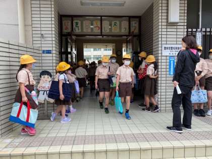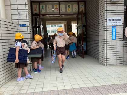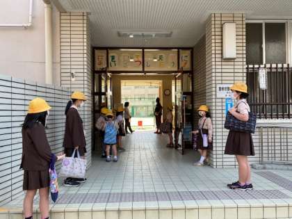 写真は、登下校のようすです。次のグループが待っているところを前のグループが下校しています。